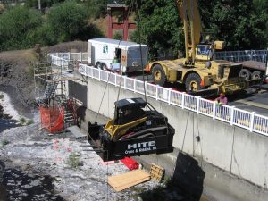 Lowering equipment into the Spokane River.