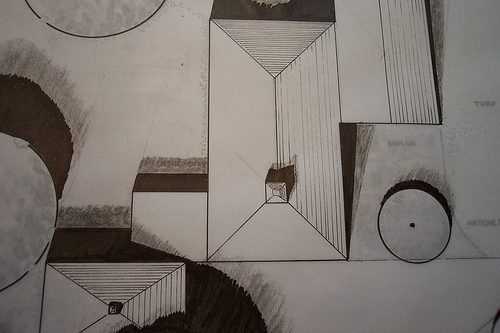 sun/shade study, pen & ink on vellum w/charcoal and graphite pauche on reverse.