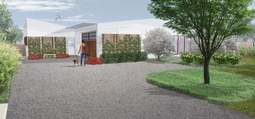 The owners of the property faced a dilemma, as the original home was a conjoined house and office, each with an entrance facing the street. With guests continually entering the office door, this design purposefully redirects views to the home’s main entrance.