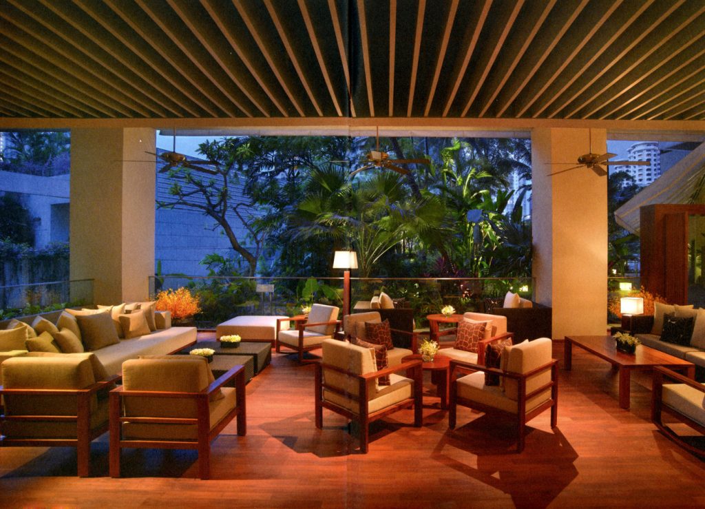 This is and open air lounge area outside the Damai Spa at The Grand Hyatt Singapore. Overlooking the revovated and redesigned rooftop pool area. the interior designer was Super Potatoe out of Tokyo, Japan