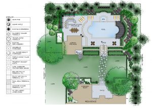 Formal pool and cabana existing. Create design to accent formal design of house and pool. Cad base, photoshop rendered.